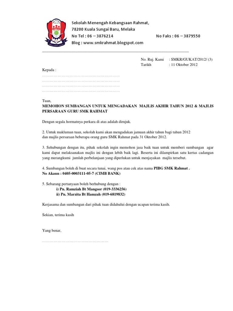 Saya bagi pihak kelab guru dan kakitangan smk telok gadong ingin memohon sumbangan berbentuk kewanganhadiahbarangan untuk jamuan akhir tahun. Contoh surat memohon sumbangan. Contoh surat rasmi memohon sumbangan kewangan contoh surat.